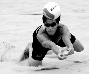 | 9月27日,在第十一届全运会男子沙滩排球决赛中,福建队球员陈诚/李健以2比0战胜上海队球员李佳鲁/徐林胤,夺得冠军。图为福建队球员李健在决赛中救球。 新华社发 |