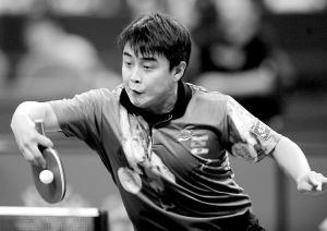 9月27日,在山东青岛举行的第十一届全运会乒乓球男子团体半决赛中,解放军队以3比0战胜山东队,晋级决赛。图为解放军队选手王皓在比赛中回球。新华社发 ■ 全运会前奏