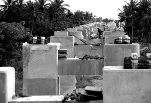 周长生来海南前的当年3月份,岭八段就从八所开始动工了,全线展开。为保证土石所需,工人们在岭头和黄梅岭开辟了两个巨大的采石场。但次年4月,突然接到省、部通知:因国家缩短基建战线,奉命缓建,岭八段全线停工。此时,全线桥梁虽仍没动工,但部分地段路基土石方和涵渠工程已完成。