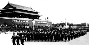 在天安门城楼上观礼的年轻的冯子平,激动的胸膛难以平静。他回忆,毛主席的声音刚落下,司仪便宣布阅兵式开始,激越人心的《解放军进行曲》响起,中国人民解放军代总参谋长聂荣臻由东三座门乘敞篷车开到华表,朱德总司令乘敞篷车由天安门出来过金水桥,在东华表下两车相遇。聂荣臻行了一个军礼,并报告中国人民解放军三军列队完毕,接受总司令检阅。朱总司令回礼后,驱车出东三座门,在军乐的雄壮声中检阅了陆海空三军部队。