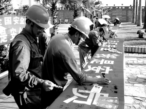 | ← 安全生产,实现安全发电,为海南经济建设提供电力保障。图为华能海南发电股份有限公司员工在安全生产倡议条幅上签名。 |