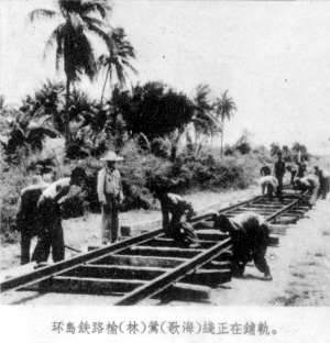 | 1959年,环岛铁路榆(林)莺(歌海)线正在铺轨。同年10月1日,环岛铁路第一期工程安(游)黄(流)线正式通车,向新中国成立10周年献礼。 |