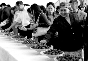 9月28日,新疆·若羌第二届楼兰文化节暨楼兰红枣节在若羌县开幕,参观者在楼兰红枣节上品尝红枣。新华社发