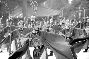 9月28日,在曲阜孔庙大成殿前,祭祀人员参照明代礼制表演祭孔礼乐。 当日,曲阜举行盛大祭孔大典,纪念我国春秋时期伟大的思想家、教育家、儒家学派创始人孔子诞辰2560周年。 新华社记者 范长国 摄
