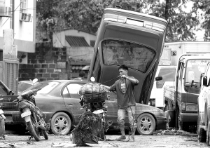 9月28日,在菲律宾首都马尼拉附近,洪水退去后一辆汽车翻倒在另一辆汽车上。热带风暴“凯萨娜”过境菲律宾引发山体滑坡和40年罕见洪灾,目前已确认73人遇难,另有23人下落不明 。 新华社/法新