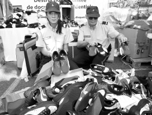 9月28日,在法国东南部城市戛纳举行的一个打击假冒产品宣传活动中,海关工作人员展示缴获的仿冒名牌产品。当天,这里的海关人员在打假活动中销毁了今年夏天缴获的2万多件仿冒产品。 新华社/法新