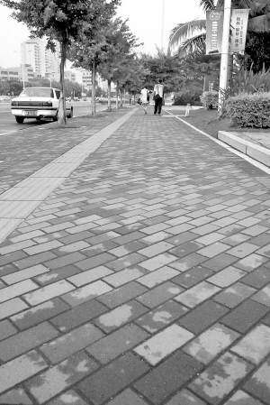 美兰区国兴大道靠近海府路下坡路段的人行道上,枣红色地砖在雨水冲刷下更显得洁净,地面上看不到一点垃圾。
