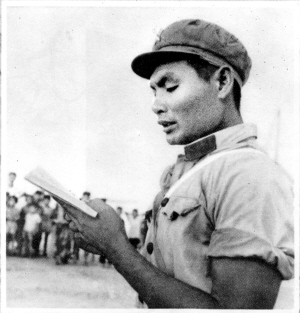 | 下水前,排长黄信雄给战士们读毛主席语录,用毛泽东思想鼓舞大家武装泅渡琼州海峡。