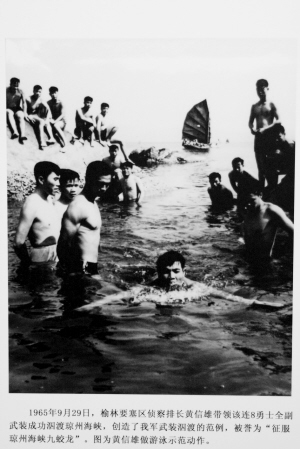 《以大无畏精神战胜水流湍急的天险,海南九名侦察兵武装泅渡琼州海峡,全程游了三万四千四百米,共用8个半小时》(载1965年10月7日《南方日报》一版)。