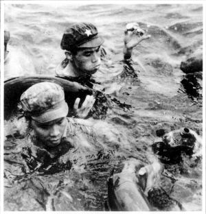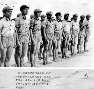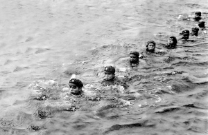 | 1965年国庆前夕,解放军驻琼某部侦察分队的侦察兵,在曾获侦察兵武装泅渡比武第一名的黄信雄排长带领下,全副武装泅渡琼州海峡成功。图为九勇士始终保持队形,奋勇前进。 |