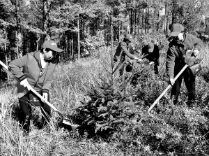 共和国同龄人同栽“国庆林” 9月29日,牡丹江市几位共和国同龄人在“国庆林”地植树。 当日,黑龙江省牡丹江市60位生于1949年10月1日的老人来到北山,栽下60棵云杉树苗,共迎新中国60华诞。 新华社发