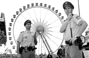 德国 9月29日,在德国南部城市慕尼黑举行的啤酒节上,两名警察在街头警戒。由于受到一系列恐怖威胁,正在举行啤酒节的慕尼黑加强了警戒。慕尼黑啤酒节于9月19日至10月4日举行。 新华社/法新