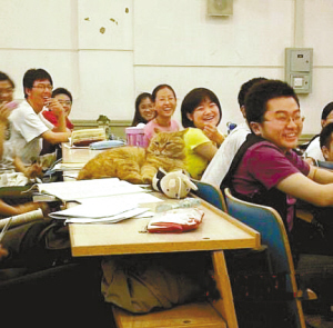 近日,在北大未名站出现了一个题为《记北大一只值得尊敬的猫》的帖子。在帖子中,一只上了年纪的猫出现在北大课堂上,跟学生们一起“听课”。它时而蹿到讲台上成老师状,时而趴在课桌上成认真“听课”的学生,这一切都被一位自称是北大学生,署名为“北大老混混”的网友拍下。