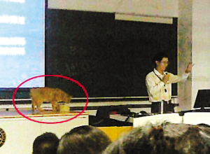| “学术校猫”在讲台上”监督“老师讲课。 |