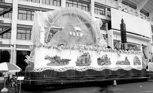 为防万一,所有彩车上都有推车人员,可在彩车出现故障等情况下推车前进而不影响游行正常进行。为了控制成本,每辆彩车都制定了回收利用的方案。
