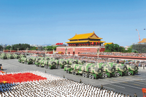 | ↑ 核导弹方队接受检阅。 新华社记者 丁林 摄 |