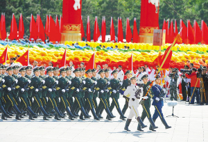 | 中国人民解放军三军仪仗队通过天安门广场。 新华社记者 杨磊 摄 |