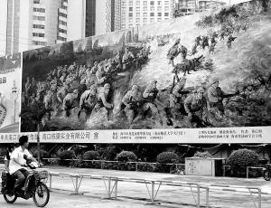 | 2009年9月29日,在海口市万绿园,路过的市民被大型历史油画作品《解放海南岛》所吸引。据了解,该作品由省油画学会主席黄信驹所作,其磅礴的气势与栩栩如生的人物造型吸引了不少市民,同时为新中国60华诞献上一份贺礼。