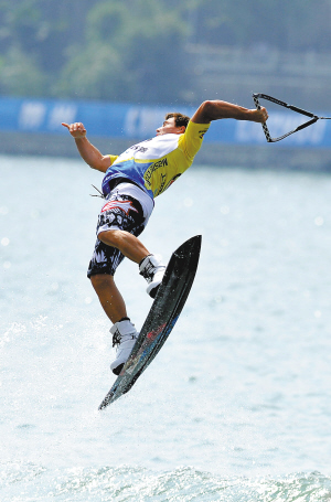 10月2日,首届世界水上极速运动大赛在广西柳州举行,来自世界30多个国家和地区的200多名选手参赛。本次世界水上极速运动大赛包括世界杯滑水赛、世界水上摩托锦标赛和F1摩托艇世界锦标赛三个世界水上运动项目。图为新西兰选手韦瑟罗在男子尾波比赛中。 新华社发