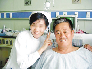 | 赵本山(图右)在9月30日手术之后,身体恢复状况良好。10月2日下午,本山传媒首次发布了赵本山手术后的照片。在这张与护士的合影中,赵本山显得面色红润,气色很好。 马刚 摄 |