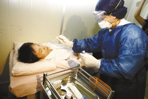 | 9月29日,卫生防疫人员正在为“甲流患者”作病毒检查。当日,上海市静安区卫生防疫部门举行甲流疫情防控演练,以提高卫生系统应对甲流的应急处理能力。【资料照片】 新华社发 |
