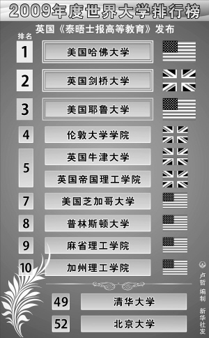 新华社专电 英国《泰晤士报高等教育》8日发布2009年度世界大学排名榜,美国和英国大学占据榜单前10名,亚洲大学排名有所提升。