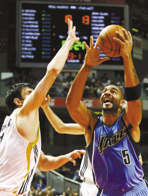 9日,在马德里举行的NBA欧洲赛中,爵士队以109:87胜皇马队。爵士队布泽尔(右)在比赛中上篮。 新华社发
