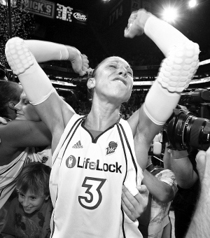 10日,在WNBA总决赛最后一场争夺中,水银队主场以94:86击败狂热队,从而以3:2的总比分夺冠。图为水银队陶拉西庆祝胜利。 新华社发
