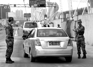 10月10日,搜爆部队战士在上海世博园区浦东主出入口对车辆进行检查。随着10月13日上海世博会倒计时200天的到来,解放军某搜爆部队进驻世博园区,在主出入口、重点场馆等地对进出车辆进行搜爆检查,确保园区安全。 新华社发