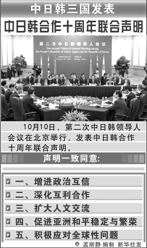 | 10月10日,中日韩三国发表中日韩合作十周年联合声明现场。 新华社发 |