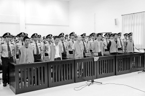 | 10月10日,被告人卢小强、廖右军、陈意有、亚尔麦麦提江·伊斯马伊力、奥斯曼江·奥布力、玉苏普江·图尔(前排从左至右)在韶关市武江区人民法院接受审判。