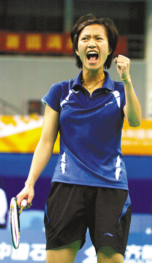 11日,在全运会羽毛球女子团体半决赛中,广东队以3:0战胜湖北队,晋级决赛。图为广东队选手夏静云得分后庆祝。 新华社发