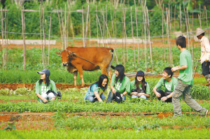 | 距海口6公里的火山泉“农家乐”里,一群来自海口的年轻人体验摘菜的乐趣。 |