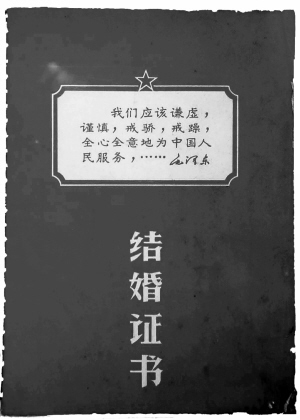 到了1971年,文革期间的结婚证是男方、女方共同持有一本结婚证书,结婚证上印刻了明显的政治色彩,封面上有“我们应该谦虚、谨慎、戒骄、戒躁,全心全意为人民服务……”的毛主席语录,封底则加印了另外一句毛主席语录:“我们作计划、办事、想问题,都要从我国有六亿人口这一点出发,千万不要忘记这一点……要使我国富强起来,需要几十年艰苦奋斗的时间,其中包括执行厉行节约,反对浪费这样一个勤俭建国的方针。”