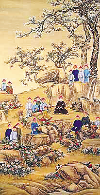 此外,围绕宫廷和上层社会的绘画艺术也达到顶峰,这就是以文人逸趣和皇家审美为主要内容的人物宫廷画。大量西方传教士的涌入,使得清朝的宫廷画不仅具有传统的宋明山水画的技法,也融合了西洋油画色彩强烈的特点。宫廷画师使用西方油画的技法来表现中国的山水,使代表文人精神的山水画得到了前所未有的革新。雍正时期,郎世宁等西方画家将油画的肖像技法带入了中国,后在皇帝的授意下,他们开始探索用中国画的形式表现油画的效果,创造性地发展了中西合璧的全新肖像画风格。