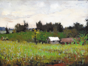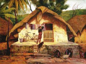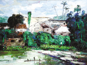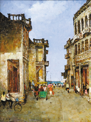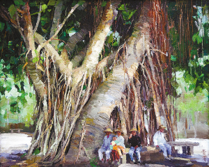 当然,这种追求还处于初级阶段,还没达到“后印象派三杰”形成风格流派之火候,但是我们不妨已经看出,在刘贵宾、王家儒、罗继贞、刘运良、蔡蔚、周国富、周铁利、牧之、陈小雄等人的追求中,已形成某些“共识”,他们已脱离简单地描摹海南大自然物象的层面,而是侧重于从精神特质的高度去把握海南的物象。像刘贵宾这次赴展的《大榕》,那榕树浓荫下的人物看似点缀,其实展现的是“生于斯,长于斯”的人们对故乡生命力象征的大榕树的依恋,这是会触动人们的乡思之情的!而《村口》画面中了无一人,可是观者却会沿着青石小路“走进”火山村口;再比如王家儒的《暮色》和《水上人家》,看似两幅海南写生作品,可画家骨子里的“自由与浪漫”精神充盈其间,一股浓浓的抒情气质通过潇洒的笔调尽情挥洒;罗继贞笔下海南“后花园”的景致中,有绿色,散发着热带植物特有的清润,有红色,闪耀着热带花朵特有的灿烂,有小鸟穿行其间,仿佛游人流连其中,陶醉欣悦于如此美景,一路欢歌。其余,如蔡蔚三亚系列中将传统文化符号与童年回忆场景熔于一炉,刘运良海边云景的壮观蓬勃,周铁利热带植物的夺目艳丽……海南大自然的勃勃生机和岛屿海洋文明的通透清润,自由包容的气度感染了画家,也进而感染了所有的观者。