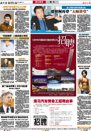 海南日报 娱乐新闻 012 2009-10-121 2009年10月12日 星期一