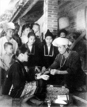 在1960年代,赤脚医生背着一个小药箱,走乡串户,基本上是凭着“一根银针、一把草药”为百姓治病。这张名为《黎寨新医》的老照片,是老摄影家蔡自强于1970年在儋州市那大镇不远的一个小黎村里所拍。