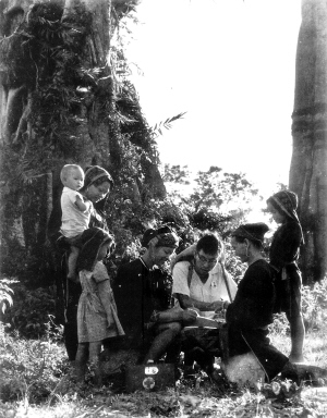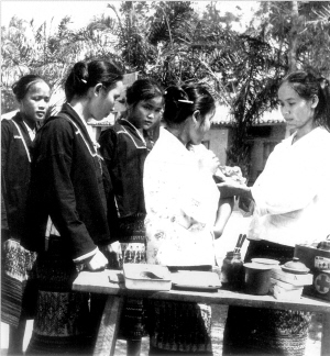 | 1970年儋县番加黎村,县医疗队的医生在指导赤脚医生为群众看病。