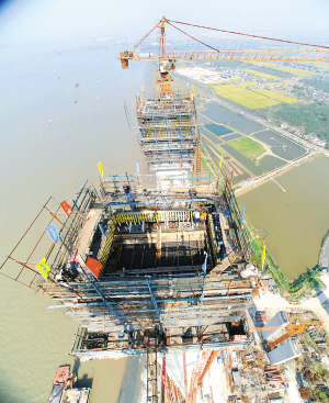 10月15日,总高180米的江苏泰州长江大桥北塔进入封顶施工。泰州长江大桥项目全长62.088公里。 新华社发