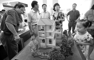 | 今年国庆长假期间,有购房意愿的市民纷纷来到所在城市的房展会咨询、选购新房。图为上海市民在某房展会上参观一个别墅楼盘的缩微模型。 新华社发 |