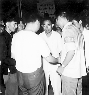 | 1967年1月23日,在上海“一月风暴”的影响下,海南区“无产阶级革命造反派联合委员会”夺海南区党委的权。图为当时的区党委书记杨泽江(中)、副书记王昌虎(左前背靠镜头)向群众组织交权时的情形。 吴秋光 摄 |
