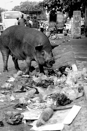 → 14日上午11时,乐东黄流镇主街道的黄流大道上,垃圾成堆。 本专栏图片由本报记者 古月 摄