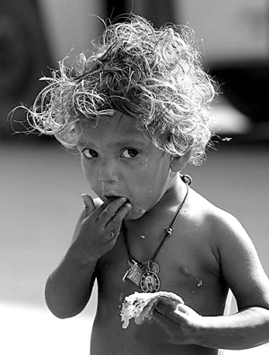 | 一名儿童在印度首都新德里的一条马路上吃东西。 来源:新华网 |