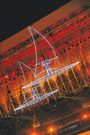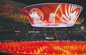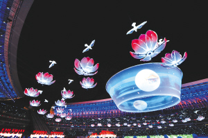 16日,在开幕式文艺表演开始时,一个蓝色“巨碗”在和平鸽的环绕下缓缓升起,悬置半空。本报特派记者 宋国强 摄