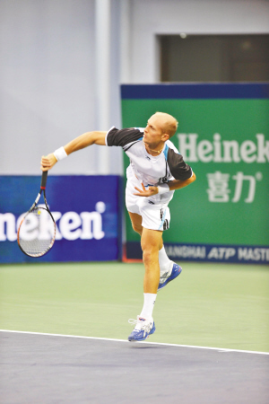 10月18日,总奖金为525万美元由喜力啤酒赞助的ATP1000大师赛上海站在旗忠森林网球中心落幕。在压轴登场的单打冠军争夺战中,素有俄罗斯“劳模”之称的达维登科历经2小时3分钟的高质量鏖战,凭借掌控全场的底线攻势,以及多达35比9的主动得分统计,最终以7-6(3)/6-3的总比分,完胜西班牙天王纳达尔,捧起了上海ATP1000大师赛的冠军奖杯。图为达维登科决战中的挥拍英姿。 (钟新)