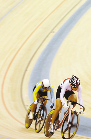 ↑ 18日,选手在男子自行车场地争先赛1/8复活赛中角逐。