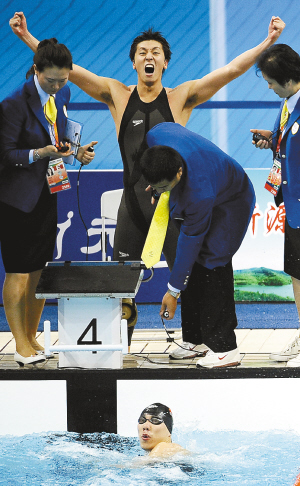 → 18日,在男子4×100米自由泳接力决赛中,北京队的陈祚率先触壁(下),史腾飞(上)振臂欢呼。北京队以3分15秒50的成绩夺冠。