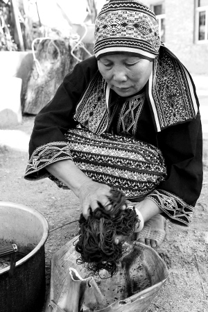 艳若云彩的传统黎锦染料全部取自天然。图为乐东黎族自治县千家镇永益村“国家非物质文化遗产项目代表性传承人”容亚美,在用一种叫“盼(音)”的乔木中间的槅拿来煮水染出红线。