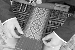 絣染时,织者把长约160厘米的筒裙经线的一端(即有小竹子固定经线的一端),套入活动扁木,在另一端插入一支小圆木棍,将经线拉平紧绷后,用绳子从两头把小圆木棍绑牢,活动扁木与小圆木棍之间便形成前后两层约20厘米宽的经线平面,接着便可捆扎经结。